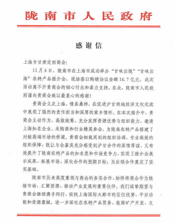 陇南市人民政府《感谢信》